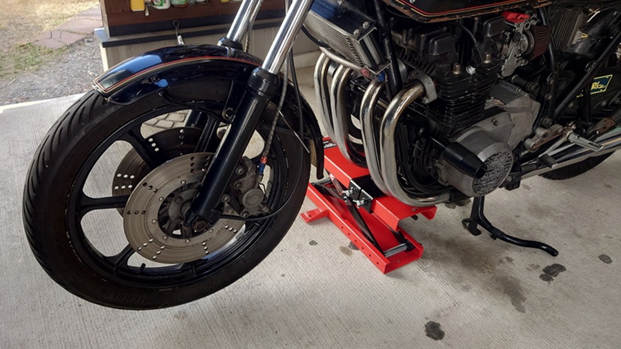 センタースタンドがなければ、リアホイールをスタンドで浮かせて、さらに前輪をジャッキアップしてやる。