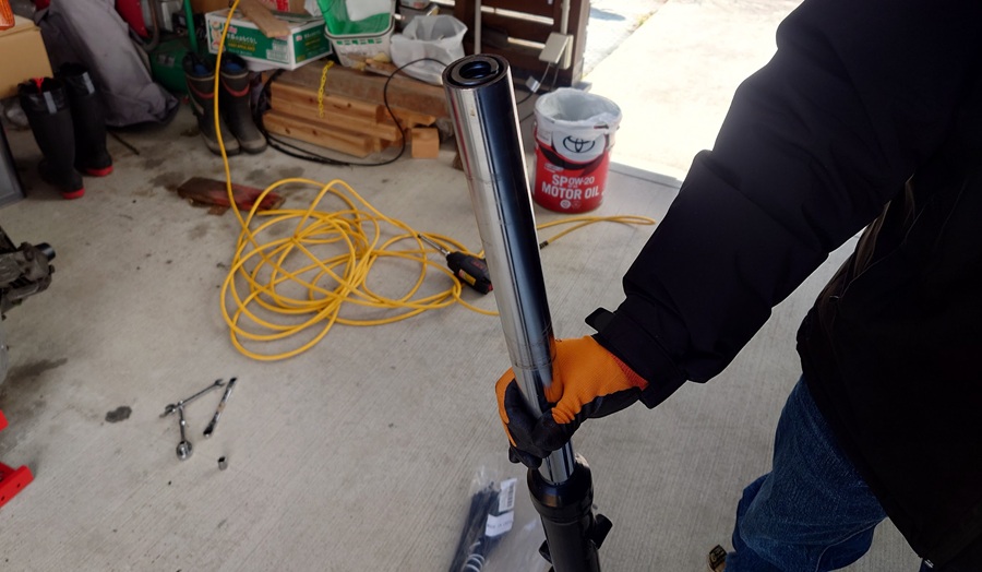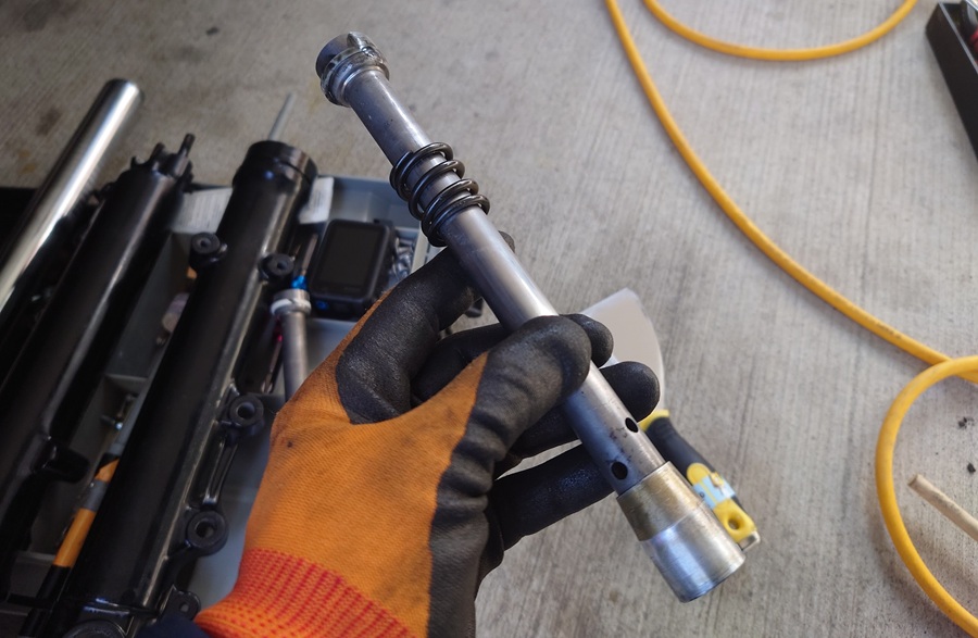 オイルを少しずつ入れてストロークさせてエア抜きして…と思いきや、底のボルトからオイルがドバドバ溢れてくるではありませんか。